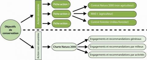 Schéma des outils Natura 2000 afin de répondre aux objectifs de conservation :
